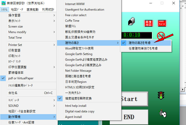 b.回線設計の最初の画面より、システム->動作環境->建物の高さ->建物の高さを考慮をチェック