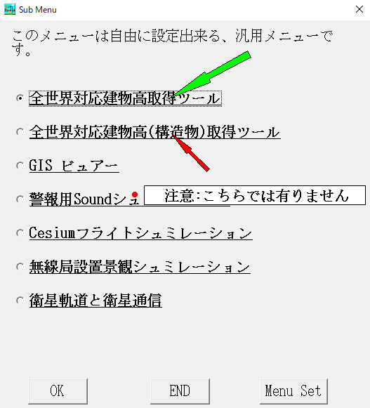 登録したい場所を選択し、Menu Setボタンを押して、候補より全世界対応建物高取得ツールを選択