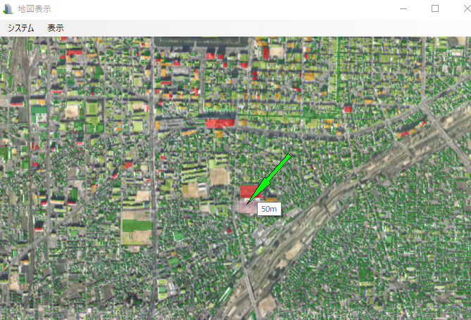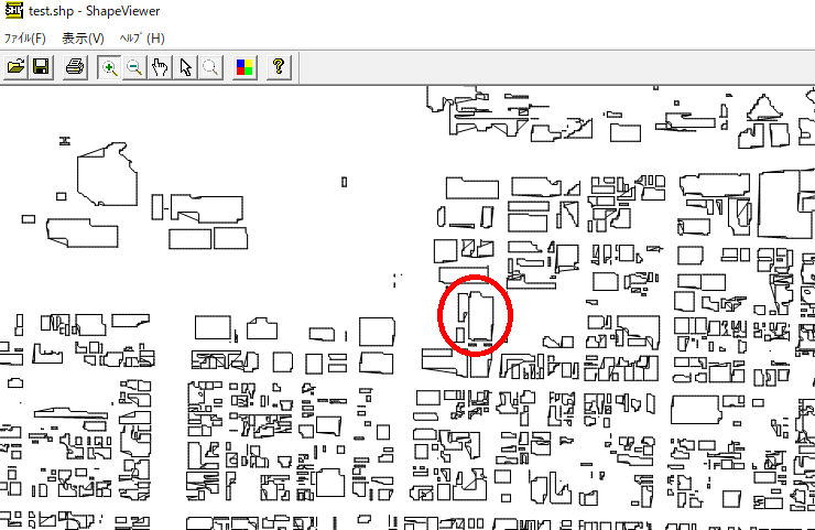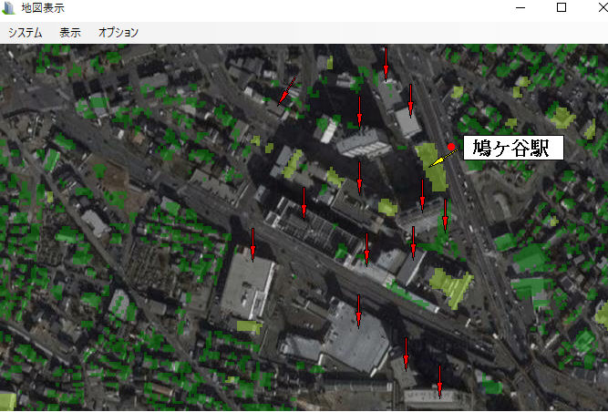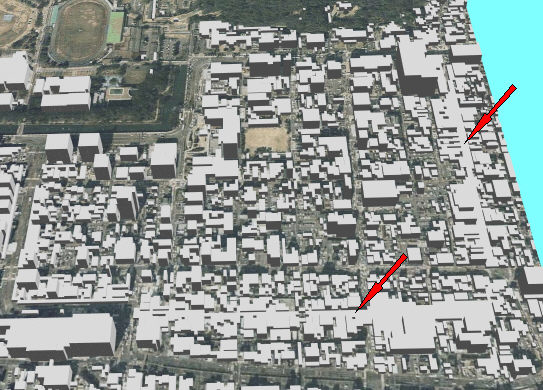 修正前で赤矢印の建物データが無いのがわかります