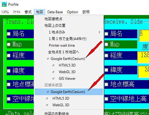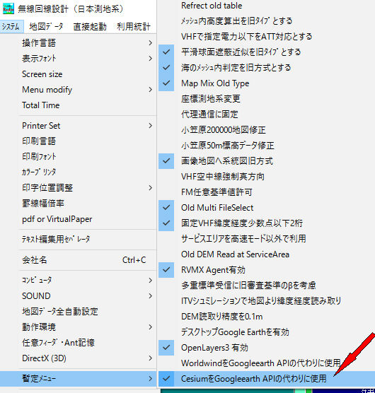 -2.回線設計の最初の画面より、システム->暫定メニュー->CesiumをGoogleEarthの代わりに使用にチェック