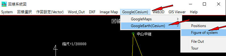 プルダウンメニューで地図->Googleearth(Cesium)(位置図)・Googleearth(Cesium)(系統図)をチェック
