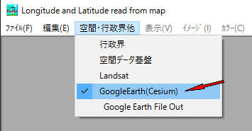 プルダウンメニューで空間・行政界他->Googleearth(Cesium)をチェック後、目的の地図ファイルを読み込み