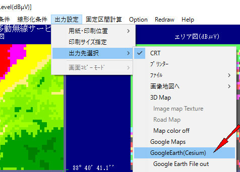 シュミレーシュン後、プルダウンメニューで出力設定->出力先選択->Googleearth(Cesium)をチェック後、出力ボタンをON
