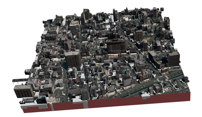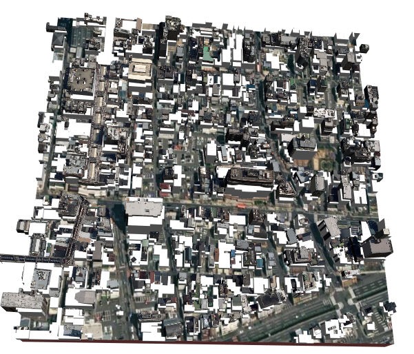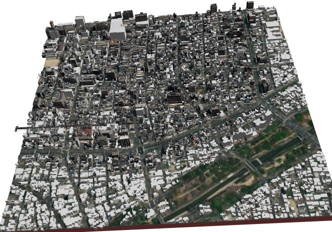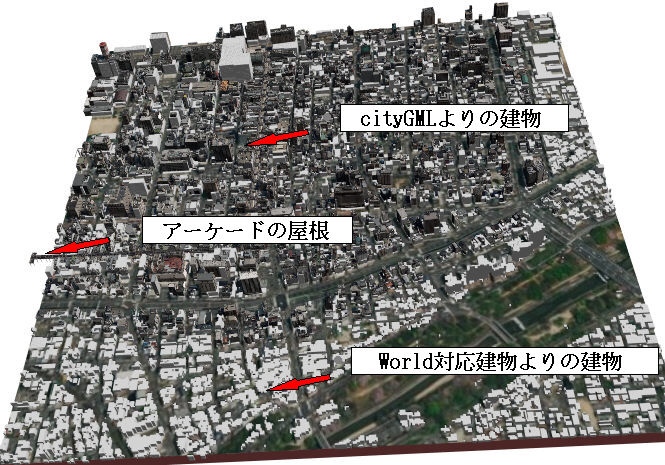 cityGML建物が提供されていない部分は世界対応建物となっています