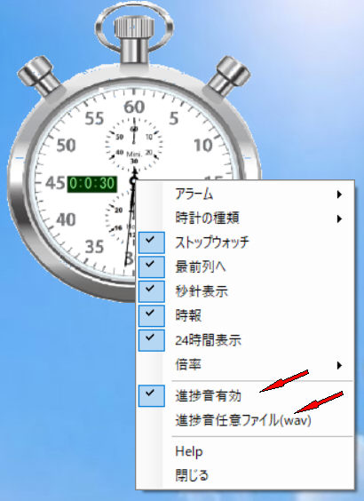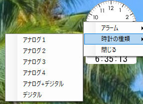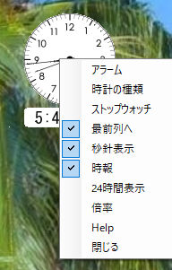 時計をマウスの右ボタンクリックでコンテキストメニューが出てきます。