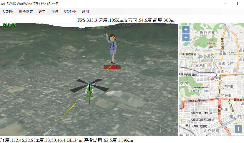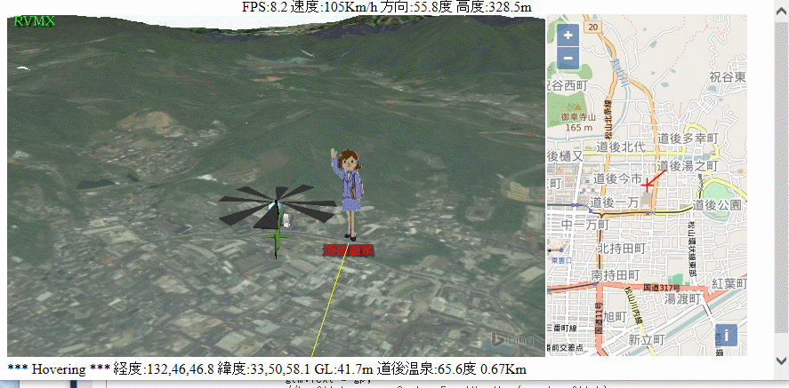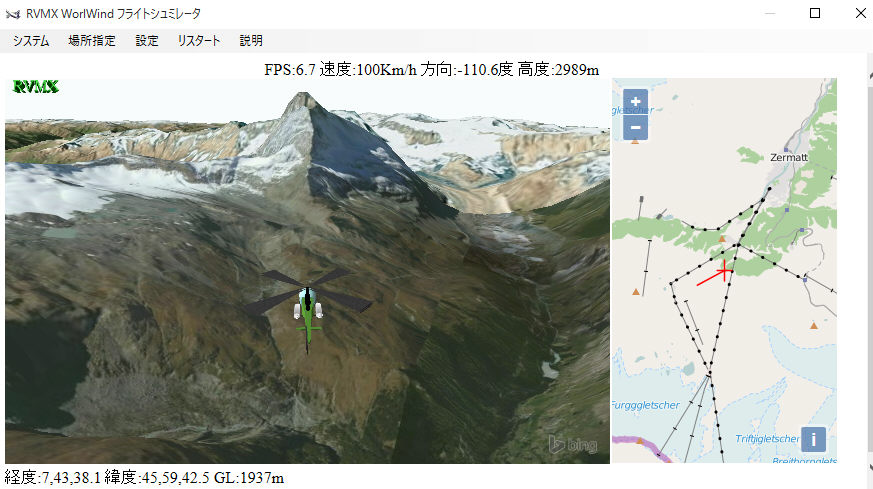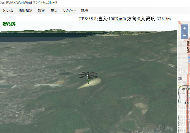 NASA Worldwindを使いRVMX社のヘリコプタによるフライトシュミレータ形式で地形調査する参考機能です。