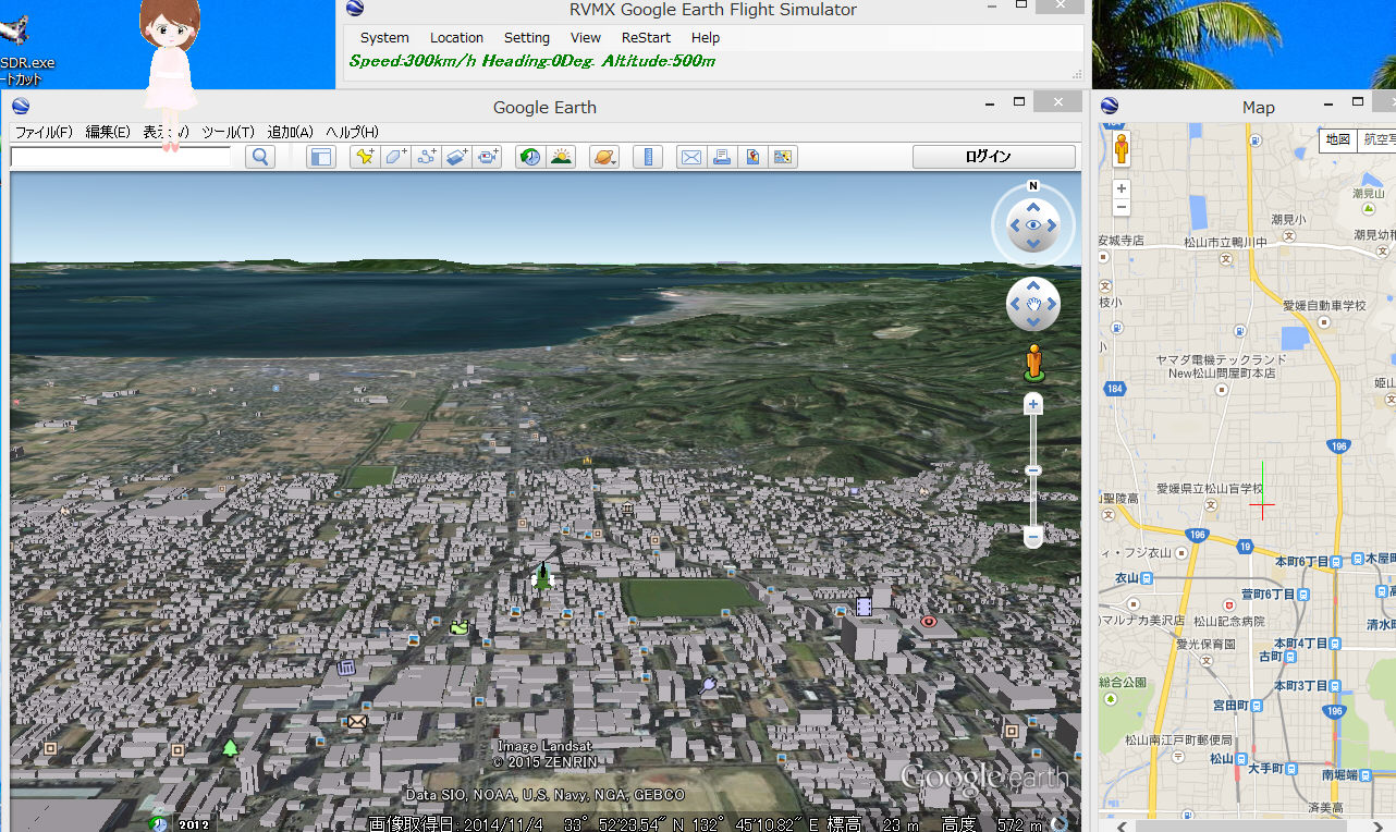 今まではGoogle EarthのScriptで動作していましたが、本機能はDesktop Google Earthを外部より制御し実現しています。(可成り無理しています)