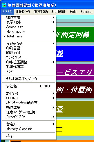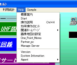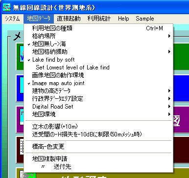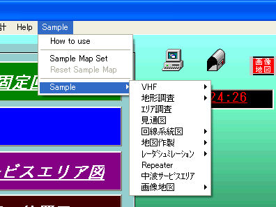 | Sample | 事前にCDをセットしておいて下さい VHF 地形調査 エリア調査 見通図 回線系統図 地図作成 レーダーシュミレータ Repeater 中波サービスエリア 画像地図 |