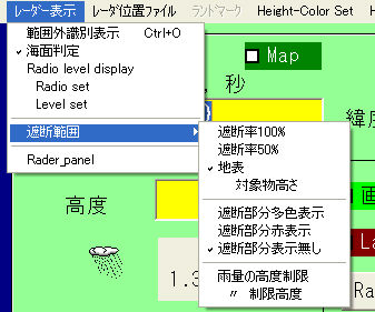 | 遮断範囲 | 遮断範囲表示 遮断率100% 遮断率50% 地表 対象物高さ 遮断部多色表示 遮断部赤色表示 遮断部表示無し 雨量の高度制限 〃 制限高度 |