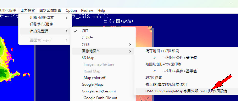 b-1.出力設定->出力先選択->画像地図へ->OSM・Bing・GoogleMap専用外部Toolエリア作図設定をクリック