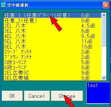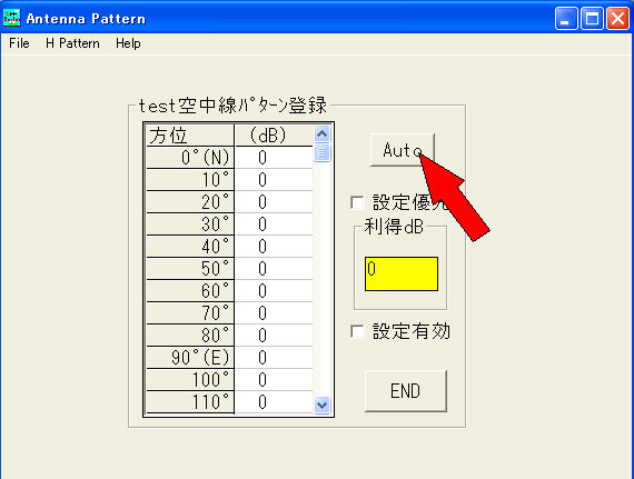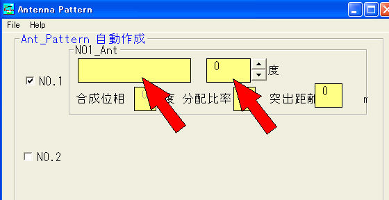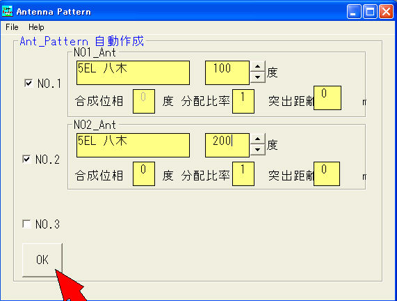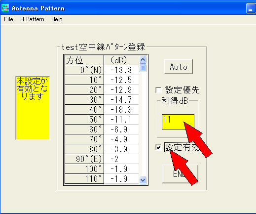 利得を入力(合成した空中線の最大利得)、但しパターンには合成損失も加味されている為、合成器損失を別途設定する必要は有りません。