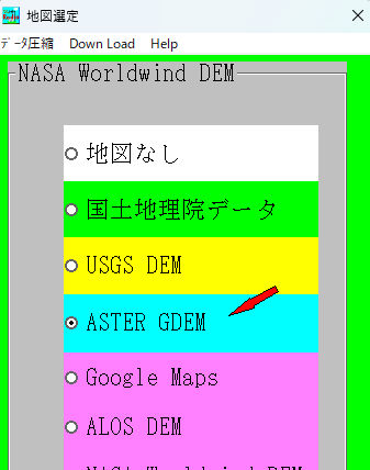 地図データ->格納場所->ASTER GDEMをクリック。