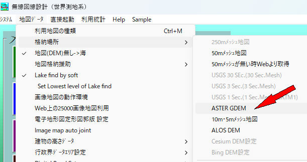 の無料の数値地形データを無線回線設計で利用する機能です。
