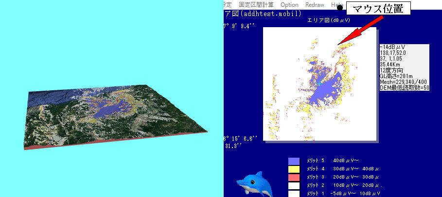 c.3D地図が表示され、電界結果画面をマウスで移動すると、3D地図がその方の視野へ回転します。