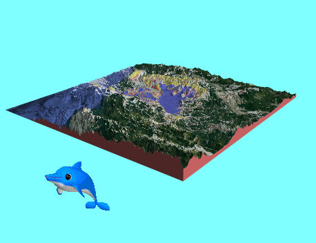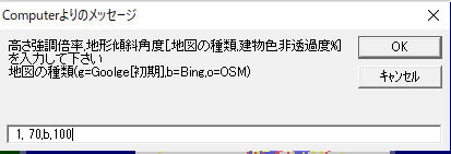 高さ強調倍率(初期値は1)と地形の傾斜角度(0度では水平表示、初期値は70度)