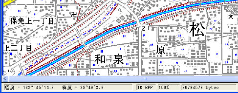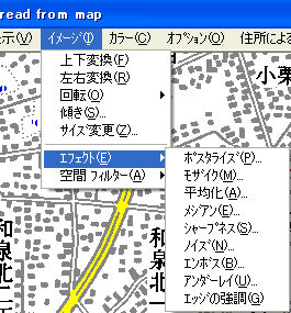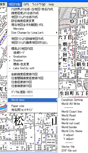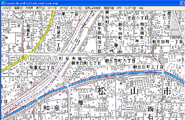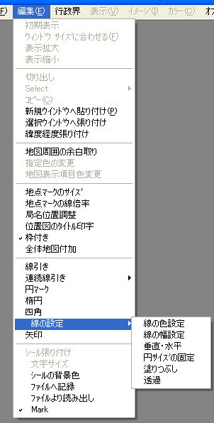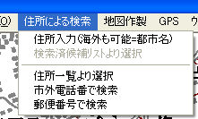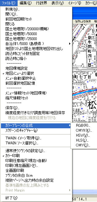 フアイル 編集 行政界 表示 イメージ カラー オプション 住所による検索 地図作成 GPS ウインドウ Help