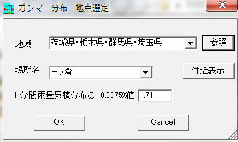 今までは、ガンマ分布による降雨減衰計算での1分間雨量累積分布の0.0075%値は数値入力となっていましたが、その選定の補助機能を追加しました。