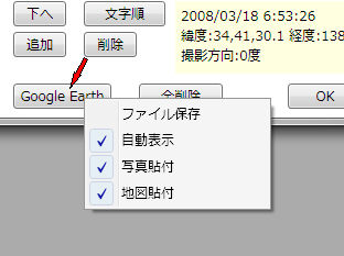 x.Google Earthボタン 画像に緯度経度が有る時、GoogleEarthで表示します。(Google Earthでアイコンをクリックすると画像が見えます)