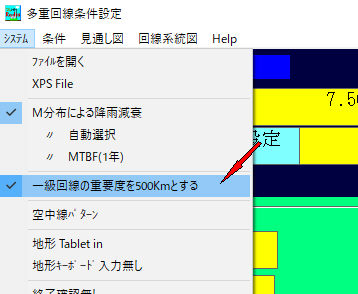プルダウンメニューのシステム->一級回線重要度を500kmとするをチェック。