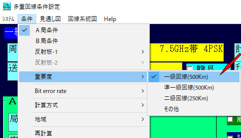 プルダウンメニューの条件->重要度->一級回線(500km)となっている。