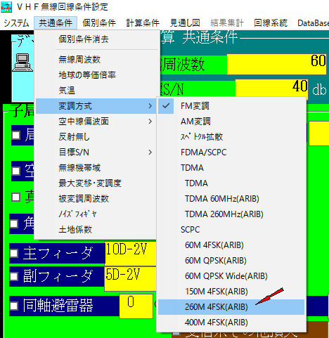 VHF・UHF固定回線やサービスエリアの無線条件設定で変調方式の変更を行います。