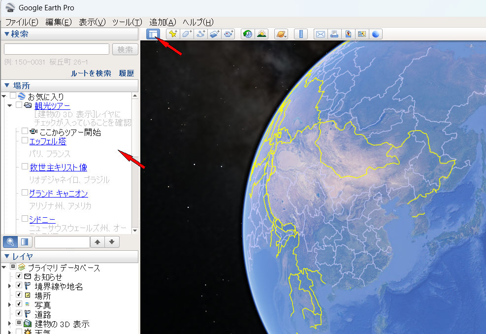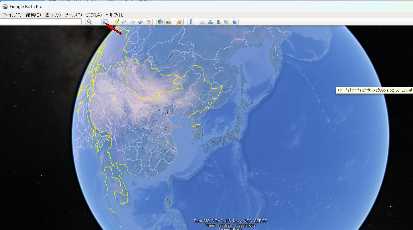 -3.動作には全画面を使うため、GoogleEarthの左側のメニューを消しておいてください。