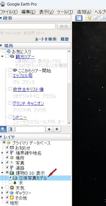 -2.建物高も有効にするため、GoogleEarthの立体写真モデルを有効にしておいてください。