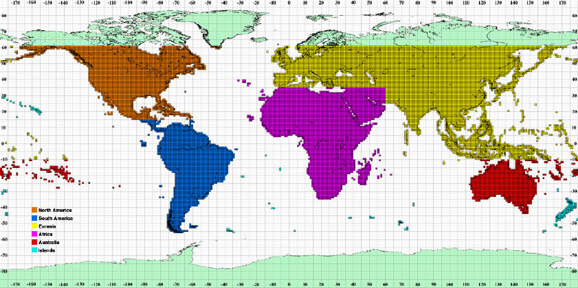 1.USGS3の現在カバー範囲(南北アメリカ・アフリカ・オーストラリアとユーラシア=黄色、他Ilands)