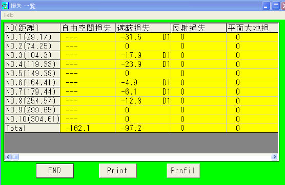 | ファイルモードリセット | ファイルモードの解除を行います。用途としては、ファイルモードで複数の局データを設定している時に、途中で中断したい時。 見通し図 −−−−−−プロフィルの表示(印刷)を行います。 損失一覧 −−−−−−計算結果の各種損失の一覧表示を行います。 一覧表の目的のセルをクリックするとセルが拡大し、右側に設計の根拠が表示されます。 |