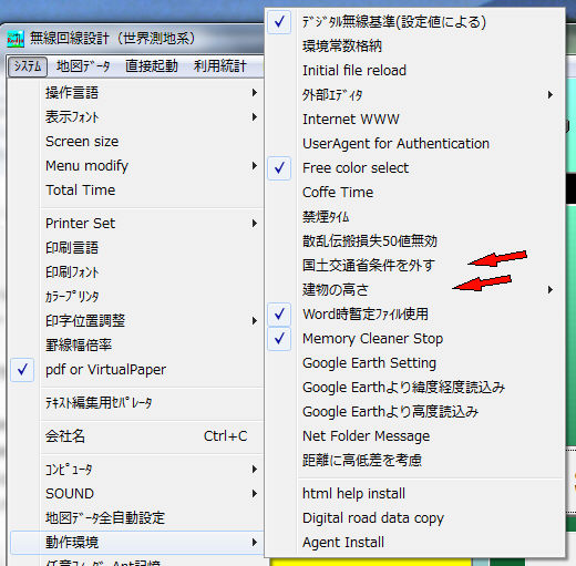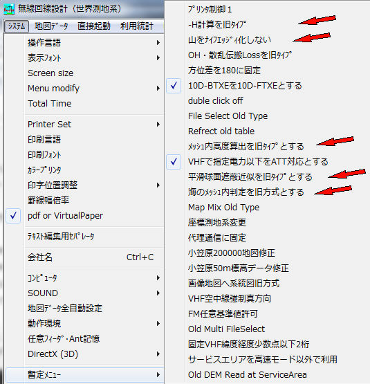-2.システム->暫定メニューで、-hを旧タイプ・山をナイフエッジ化しない・他赤矢印(これらは旧バージョとの互換の為残っている機能です)