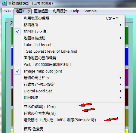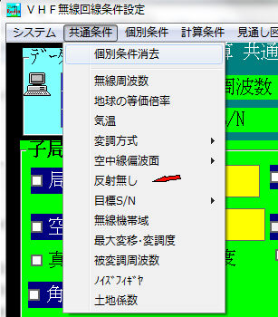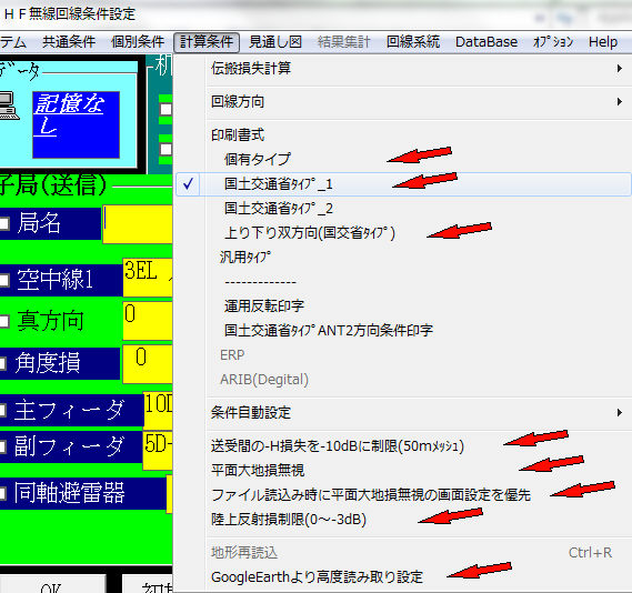 -2.計算条件の印刷書式・-Hの制限・平面大地損失無視・反射損制限他赤矢印