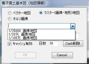 ベクター地図(ベクトルデータより作成)・ラスター地図(紙ベース等画像の地図)・オルソ画像(航空写真を補正したもの)より選択します。