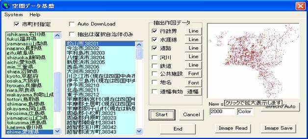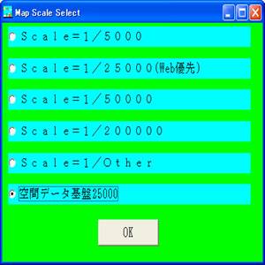 4.自動作成機能(色々な場面で出てくる、よく見慣れた画面にメニューを追加しました) 空間データ基盤25000を選択すると、自動的に必要なデータをインターネットより所得し->解凍->データ抽出-> 作図を行います。 ただし、ここでは自動作成の為、細かな設定(描く種類や線幅・色等は上記手動にて画面を開き設定した条件が使われます) |