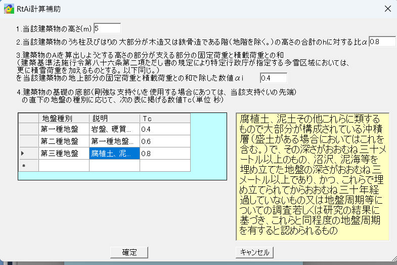 地震荷重との比較で、振動特性(軽減)係数Rt及び地震層せん断力係数Aiの直接入力またRtAi算出補助ボタンをクリック