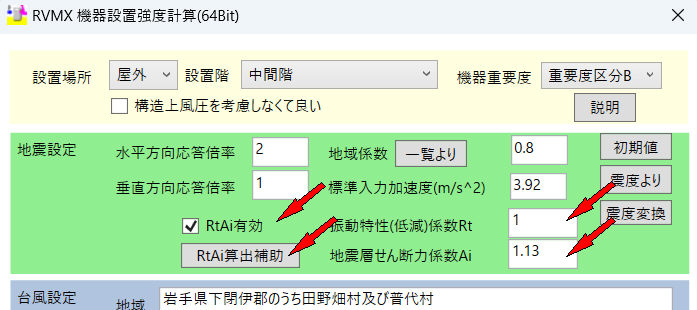 RtAi有効をチェック後、振動特性(軽減)係数Rt及び地震層せん断力係数Aiの直接入力またRtAi算出補助ボタンをクリック