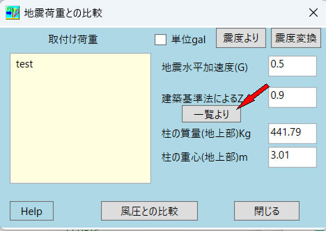 地震荷重との比較で、地震地域係数の一覧よりボタンをクリック