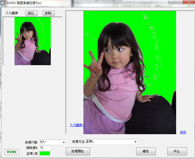 入力画像に対して、マウスで指定した指定色の範囲を曖昧度に応じて指定色で塗潰します オプション=曖昧度%及び指定色