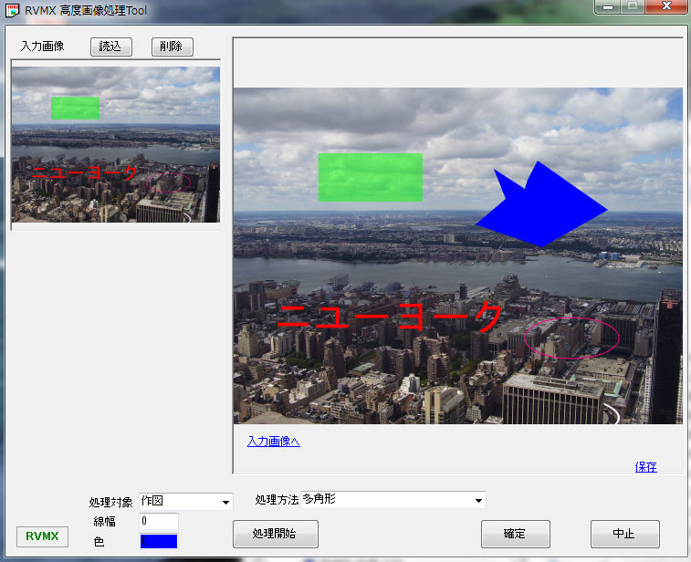 入力画像に対して、マウスで指定した指定範囲(四角)を指定色へ変換します オプション=指定色