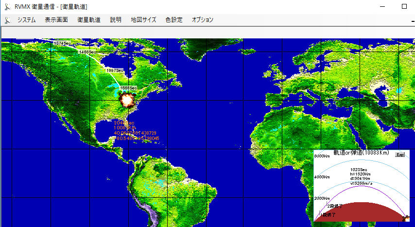 軌道予測-->最高高度1520Km、飛翔距離10083Km、飛翔時間2046秒(34.1分)