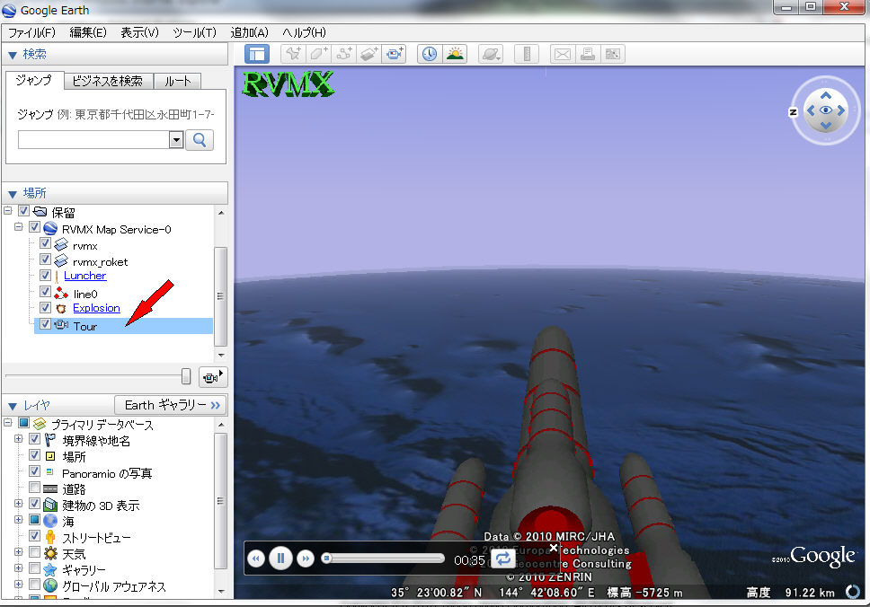 6.Google Earthへの出力例(但し、2008年版以降で有効、2007版では試用動作)