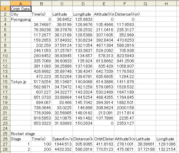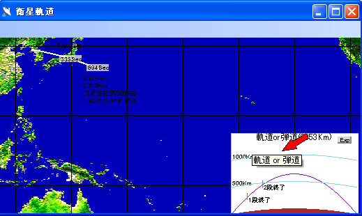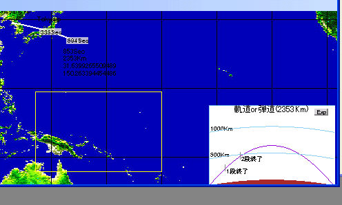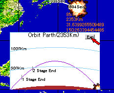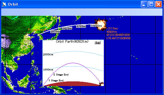 東倉里より2段ロケット、燃料モノメテルヒドラジン(液体燃料)(1段目=40000kg、2段目=6000kg)、175度方向へ発射時の予測