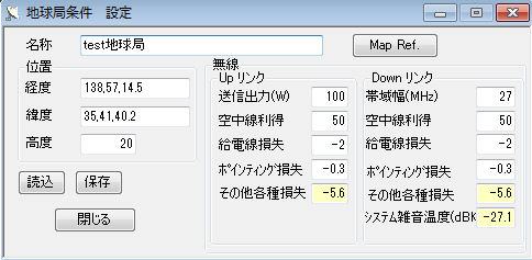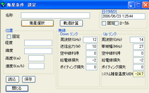 地球局条件設定画面。