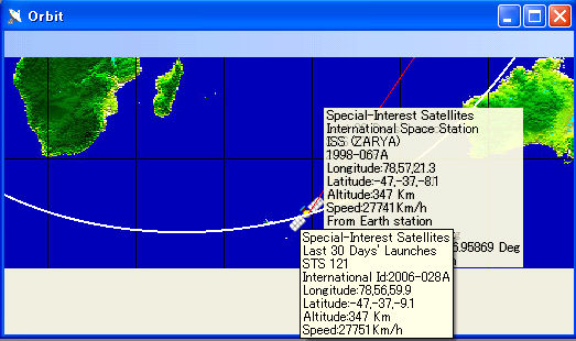 帰還に向けて分離後の[ISS(ZARYA)]とエンデバー[STS-121](2006/7/17 6:25現在)南極附近。