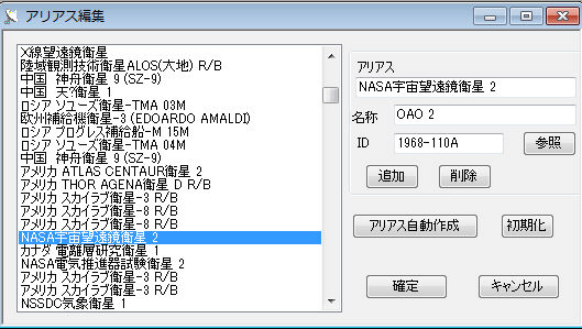 注1:アリアス自動作成ボタン 2013年版より追加されたボタンで、新しい衛星に、アリアス(日本語の別名)を自動で付けます。(但し、主な衛星のみ)
